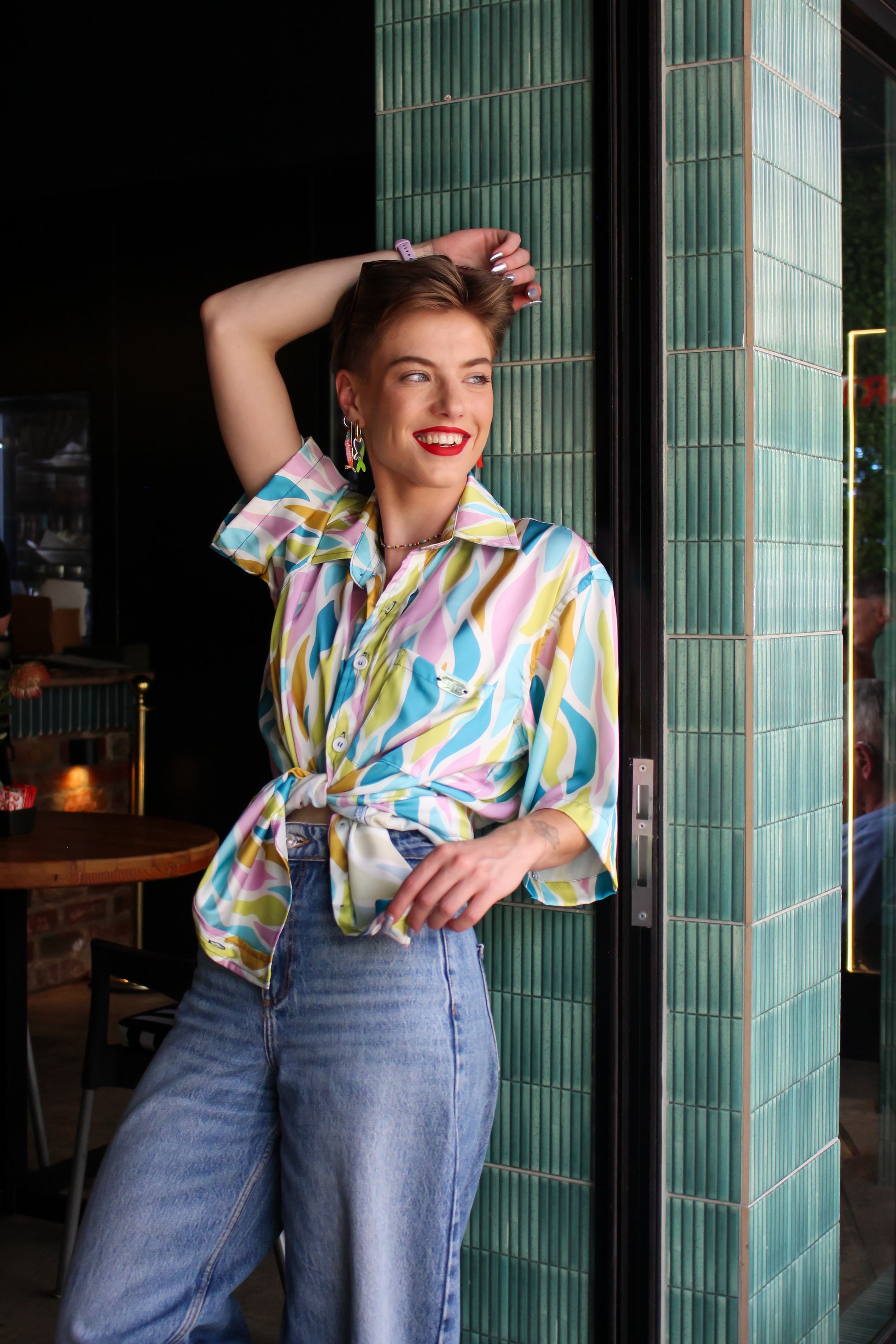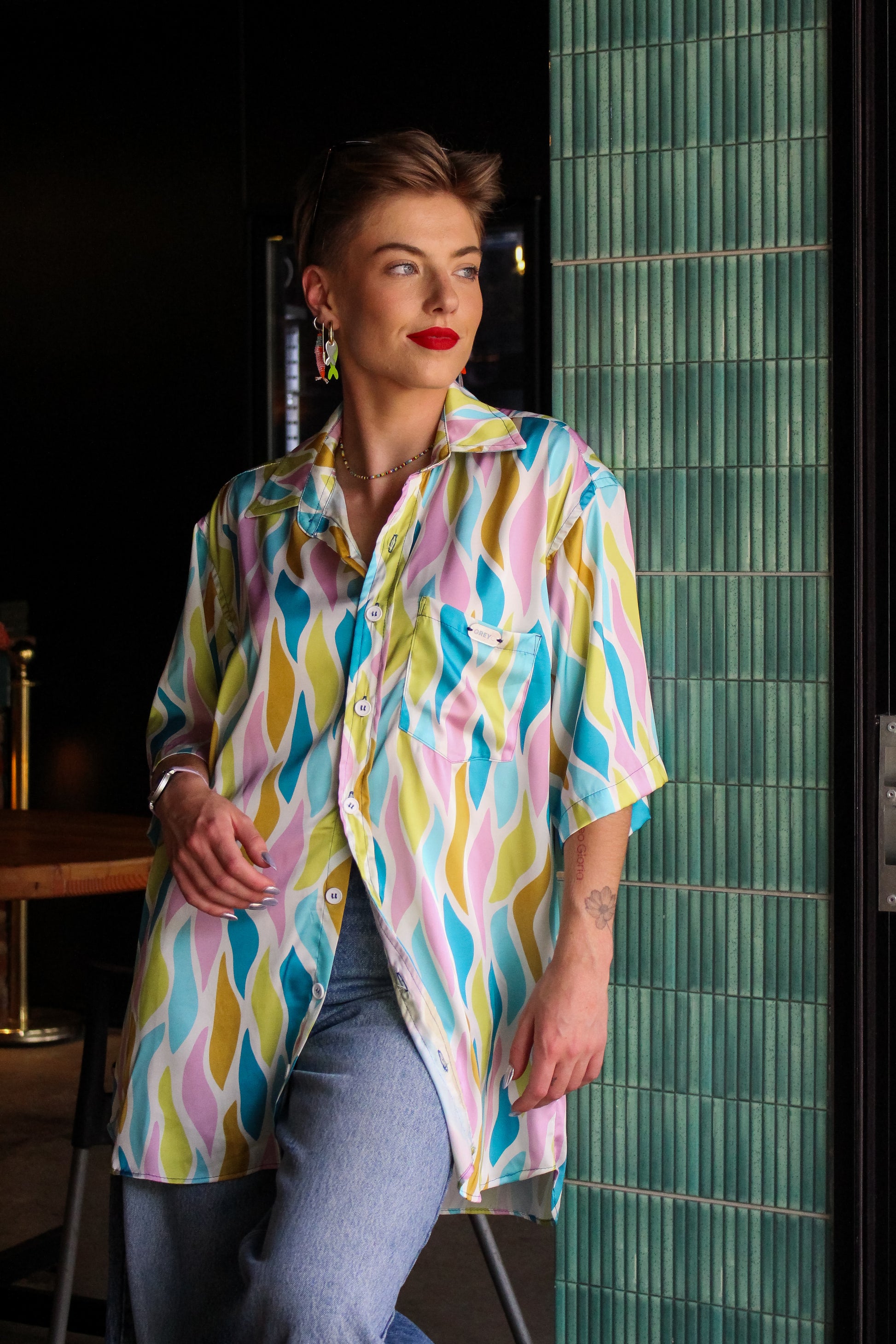 Step into color with our Cotton Candy satin shirt, a unisex piece designed to brighten every moment. Made from smooth satin, this shirt blends dreamy pastels with bold, playful designs like swirls of cotton candy skies. Its glossy finish and soft, weightless drape create a look that’s both eye-catching and effortlessly refined.